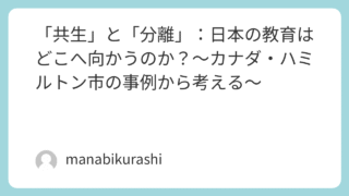 「共生」と「分離」:日本の教育はどこへ向かうのか?〜カナダ・ハミルトン市の事例から考える〜みなさんは「インクルーシブ教育」と聞いて、どのようなイメージを思い浮かべるでしょうか?カナダのオンタリオ州ハミルトンにおけるフル・インクルーシブ教育の...